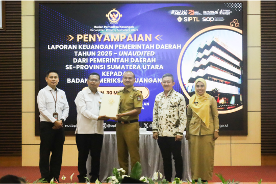 Penyerahan Laporan Keuangan Pemerintah Daerah (LKPD) Tahun Anggaran (TA) 2025 Pemko Tanjungbalai diserahkan langsung Wali Kota Tanjungbalai Mahyaruddin Salim kepada Kepala Perwakilan Badan Pemeriksa Keuangan (BPK) Sumut Paula Henry Simatupang