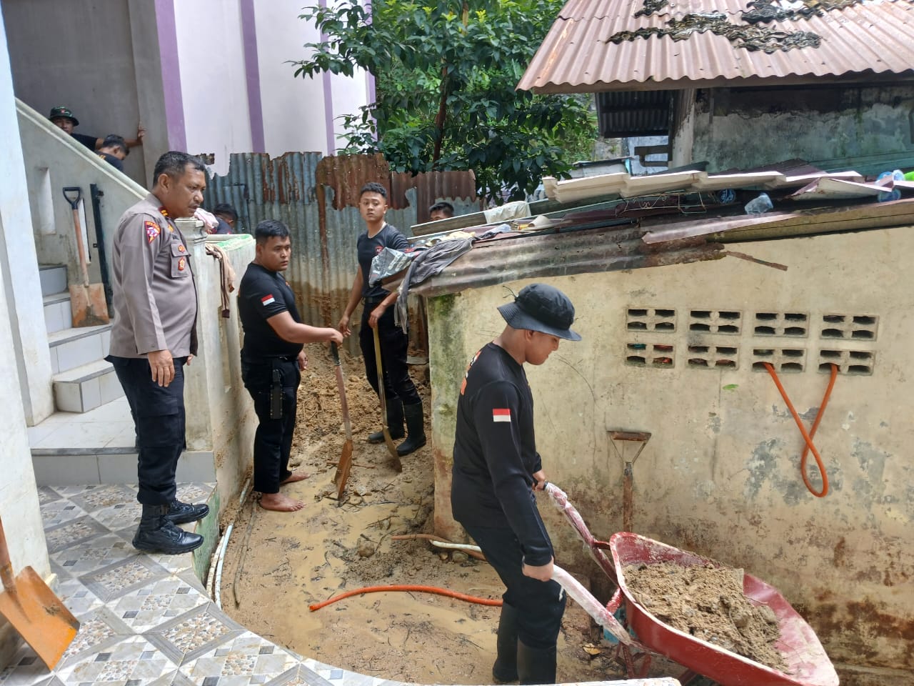 Kapolsek Sibolga Sambas, IPTU Marwa, turun langsung memimpin kegiatan tersebut bersama personel Polres Sibolga dan personel BKO Brimob. Dengan menggunakan peralatan seadanya, personel gabungan bahu-membahu membersihkan material longsor demi membuka kembali akses jalan agar dapat dilalui oleh warga.
