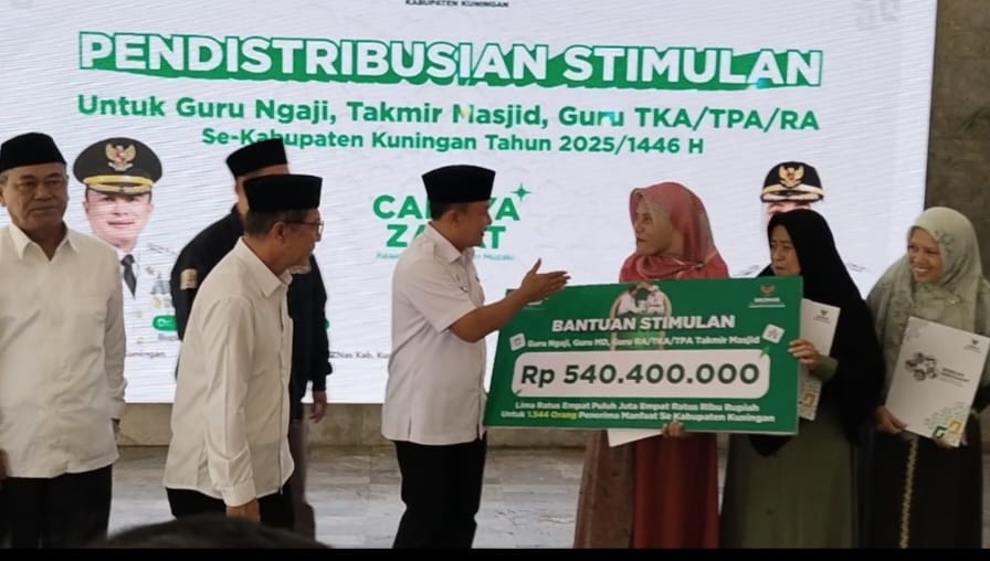 Kuningan, Busernusantrasorottv.com-Pendistribusian stimulan guru ngaji,takmir masjid, guru MD,guru TKA, TPA, Ra,se-kabupaten Kuningan Tahun Anggaran 2025, yang di gelar di pendopo kabupaten kuningan, Rabu, (21/5/2025).
