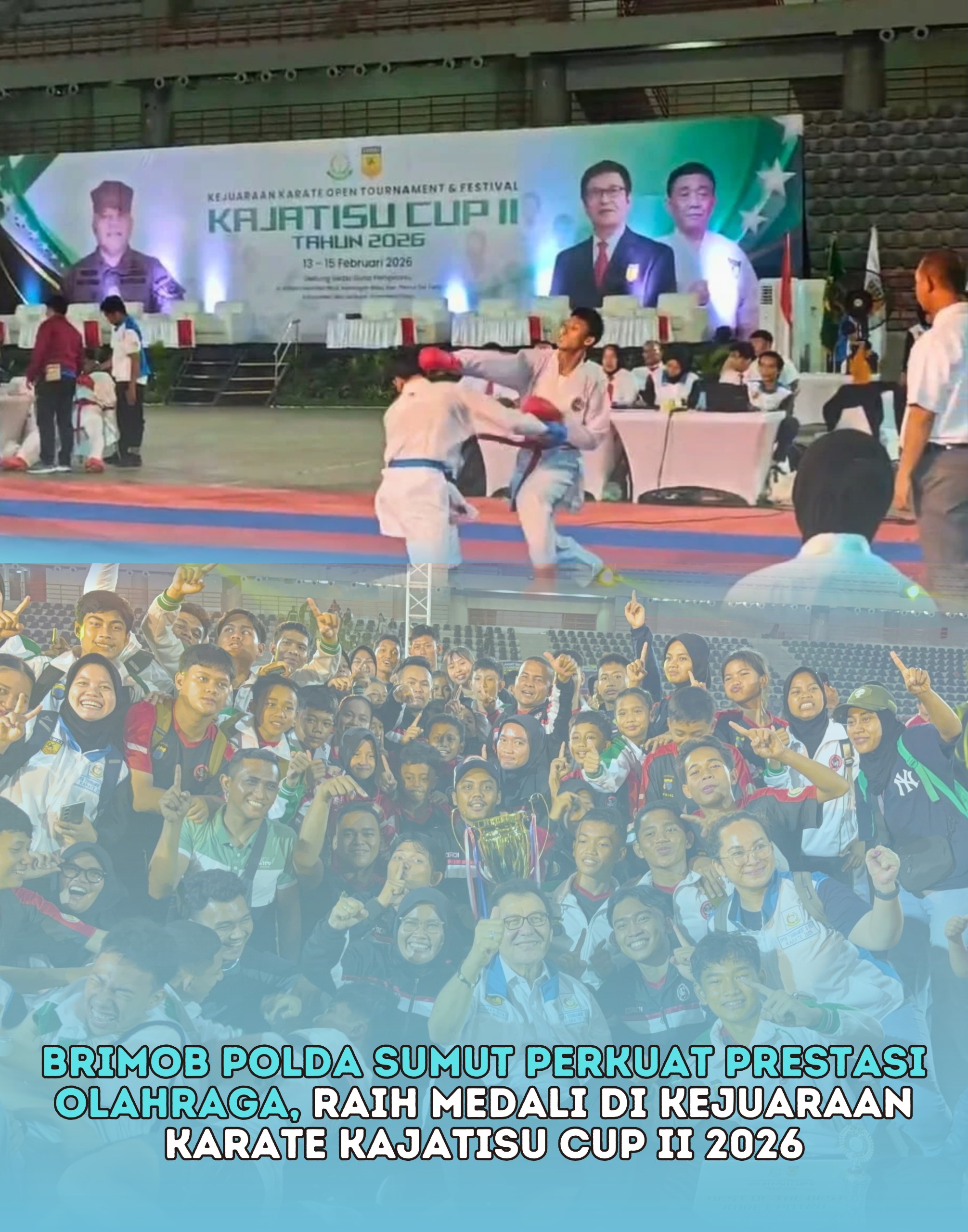 Tim karate Satuan Brimob Polda Sumatera Utara yang tergabung bersama Tim Inkanas Sumut berhasil menunjukkan performa membanggakan dalam Kejuaraan Karate Open Tournament Kajatisu Cup II 2026, yang digelar di Gedung Serbaguna Pemprov Sumatera Utara, Minggu (15/2/2026).