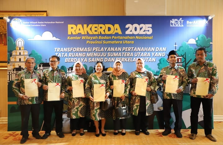 Kantor Wilayah Badan Pertanahan Nasional (BPN) Provinsi Sumatera Utara menggelar Penyerahan Sertipikat Tanah sebagai bagian dari rangkaian Rapat Kerja Daerah (Rakerda) Tahun 2025 pada Senin, 4 Agustus 2025 di Hotel Adimulia Medan. Penyerahan sertipikat ini menjadi langkah nyata BPN Sumut dalam mendukung transformasi layanan pertanahan yang cepat, akuntabel, dan memberikan kepastian hukum bagi masyarakat dan instansi pemerintah.
