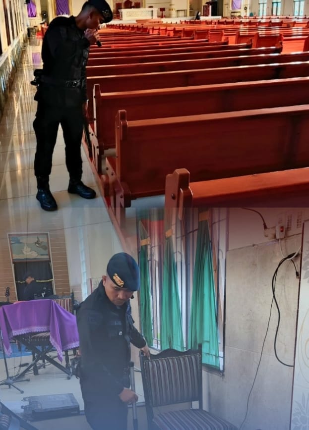 Setibanya di lokasi, personel terlebih dahulu berkoordinasi dengan pihak pengamanan wilayah sebelum melaksanakan sterilisasi secara menyeluruh. Pemeriksaan dilakukan pada berbagai area, mulai dari mimbar, ruang ibadah, kursi, sound system, hingga fasilitas pendukung seperti toilet, pot bunga, tempat sampah, serta area sekitar gereja.