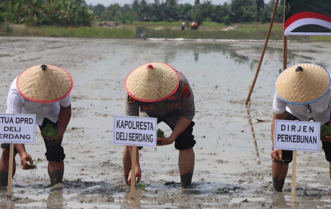 Kapolresta Deli Serdang, Kombes Pol Hendria Lesmana, SIK, M.Si turut menghadiri kegiatan Gerakan Menanam Padi Serentak di 14 Provinsi yang digelar serentak pada Rabu (23/4/2025).