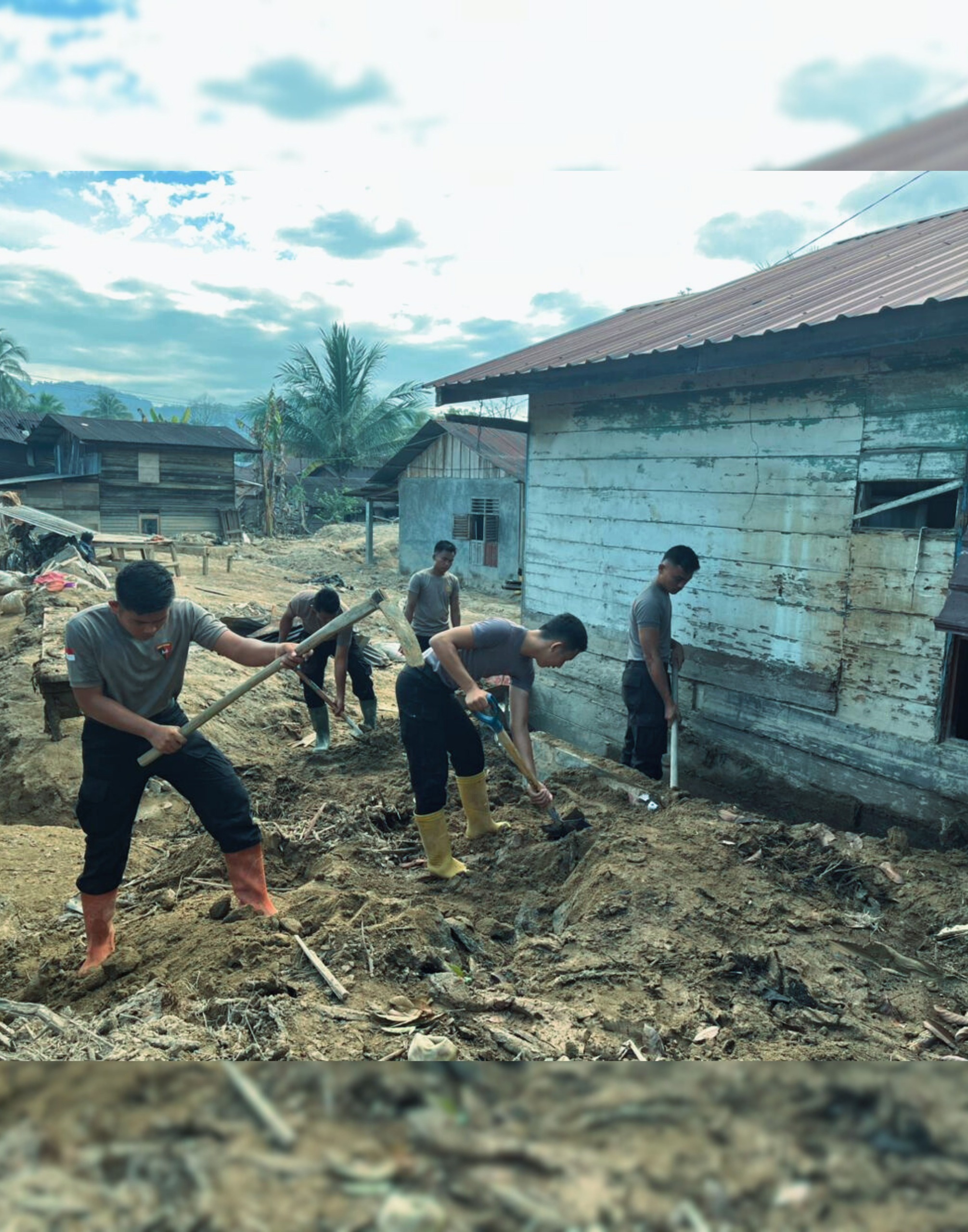 Dipimpin oleh Danton Penugasan Iptu Deny Lius Tarigan, S.H., personel Brimob bekerja secara bertahap dengan mengerahkan peralatan manual dan mesin, mulai dari cangkul, sekop, beko sorong, mesin penyedot air, hingga chainsaw, guna mempercepat proses pembersihan dan perbaikan.