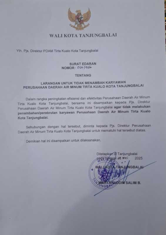 Surat edaran nomor 500/9126 tentang larangan untuk tidak menambah karyawan Perusahaan Daerah Air Minum (PDAM) Tirta Kualo Kota Tanjungbalai yang ditandatangani Wali Kota Tanjungbalai, Mahyaruddin Salim B tanggal 28 Mei 2025 menjelaskan bahwa dalam rangka peningkatan efisiensi dan efektifitas PDAM Tirta Kualo meminta agar Pjs. Direktur PDAM Tirta Kualo Kota Tanjungbalai agar tidak melakukan penambahan/perekrutan karyawan Perusahaan Daerah Air Minum Tirta Kualo Kota Tanjungbalai, jelas Rini