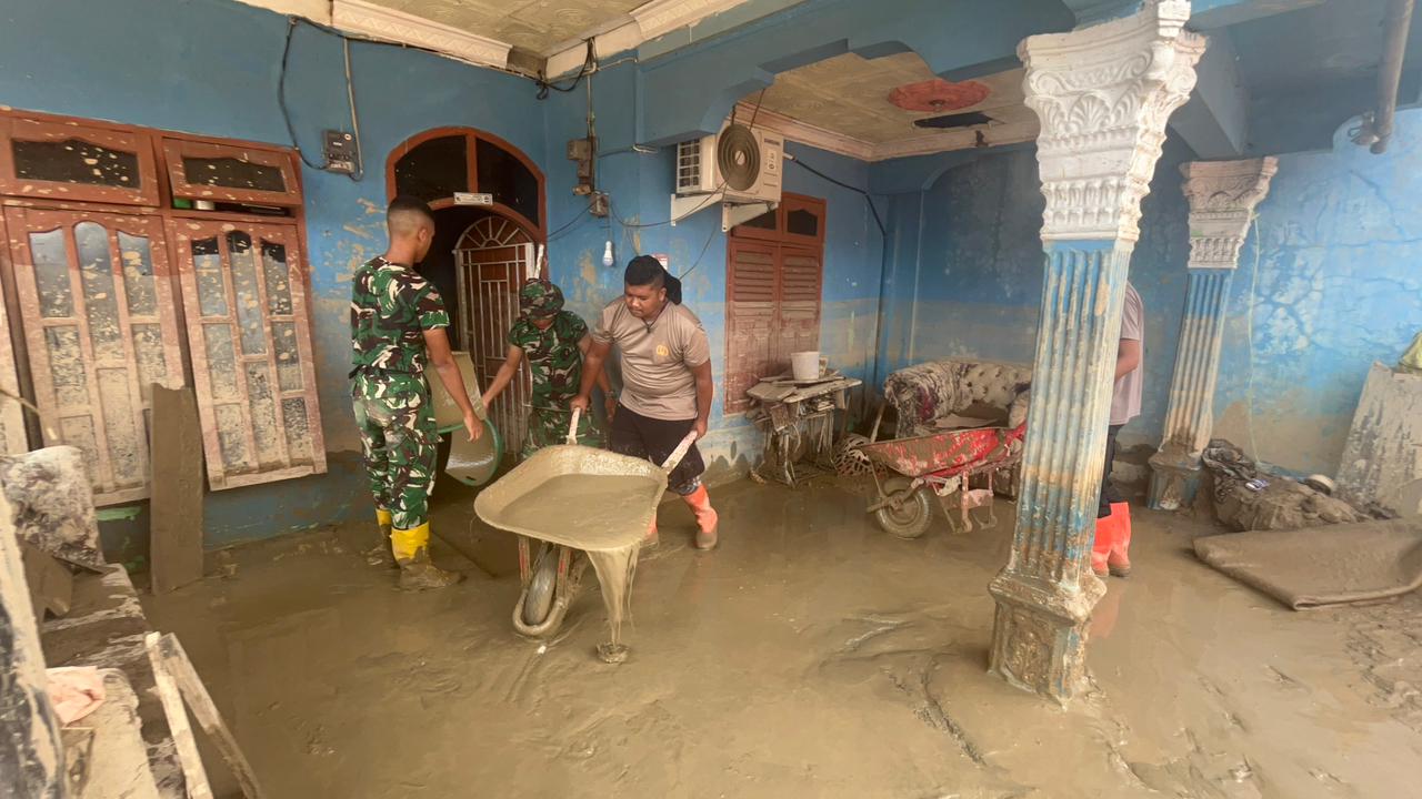 Fokus pembersihan lebih diarahkan pada bagian interior rumah yang penuh lumpur serta saluran air rumah warga yang sebelumnya tersumbat.