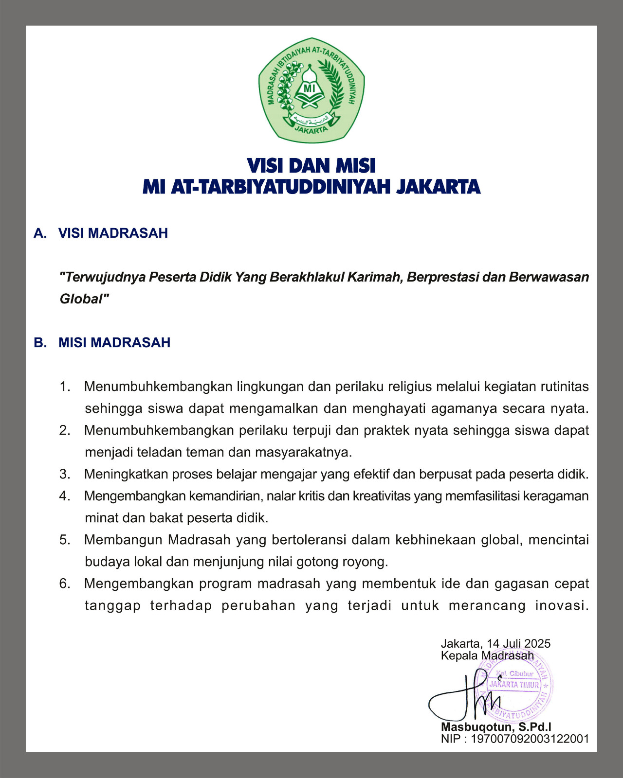 Adapun Struktur Organisasi MIS. AT-TARBIYATUDDINIYAH Tahun Pelajaran 2025-2026; KEPALA MADRASAH, Masbuqotun, S.Pd.I., KOORDINATOR BID. MADRASAH, Naryanto, S.Ag., M.Pd., KETUA KOMITE, Hanni Rosana, S.Kom., KEPALA TATA USAHA, Winanti Silviana, A.Md., TATA USAHA, Arifah Setianingsih, S.Pd., GURU KELAS 1A, Sri Wahyuni, S.Pd.I., GURU KELAS 1 B, Nani Nuraeni, S.Pd.I., GURU KELAS 2 A, Oktavia Ningrum, S.Pd., GURU KELAS 2 B., Aulia M., S.Pd., GURU KELAS 3 A, Ike Surya Dirawati, S.Pd.I., GURU KELAS 3 B, Tinawati, S.Ag., GURU KELAS 4 A, Lisa Rahmayanti, S.Pd., GURU KELAS 4 B, Mutiah, S.Pd., GURU KELAS 5 A, Tito Aprildama, S.Pd., GURU KELAS 5 B, Tsasa Sabila Yompi, S.Pd., GURU KELAS 6, Iin Marlina, S.Pd., GURU PAI, Naryanto, S.Ag., M.Pd., PEMBINA EKTRA KURIKULER ; PRAMUKA, Tsasa Sabila Yompi, S.Pd., PENCAK SILAT, Naryanto, S.Ag., M.Pd., MARAWIS, Mutiah, S.Pd., TAHFIDZ, Abdul Hamid, TARI, Oktavia Nibgrum, S.Pd., FUTSAL, Tito Aprildama, S.Pd. SISWA-SISWI SERTA PESERTA DIDIK. Penilaian Kenerja Kepala Madrasah MIS. AT-TARBIYATUDDINIYAH mendapat Nilai 96. ( Red ).