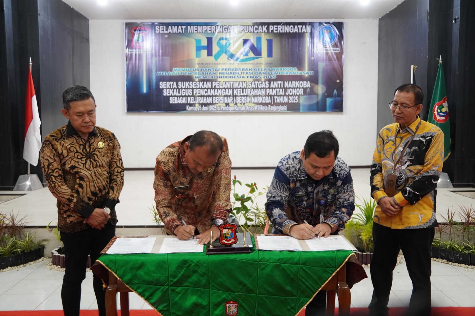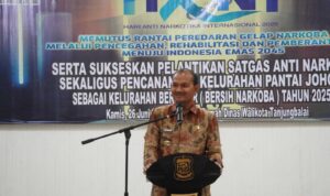 Tanjungbalai,busernusantarasorottv.com– Wali Kota Tanjungbalai, Mahyaruddin Salim didampingi Ketua TP-PKK Ny Mashandayani Mahyaruddin dan Wakil Wali Kota Muhammad Fadly Abdina didampingi Ny Desi Fadly Abdina menghadiri Puncak peringatan Hari Anti Narkotika Internasional (HANI) sekaligus Pelantikan Satuan Tugas (Satgas) Anti Narkoba serta pencanangan Kelurahan Pantai Johor sebagai Kelurahan Bersih Narkoba (Bersinar) Tahun 2025 yang dilaksanakan oleh Badan Narkotika Nasional Kota (BNNK) Tanjungbalai bertempat di pendopo rumah dinas Wali Kota, Kamis (26/6/2025)
