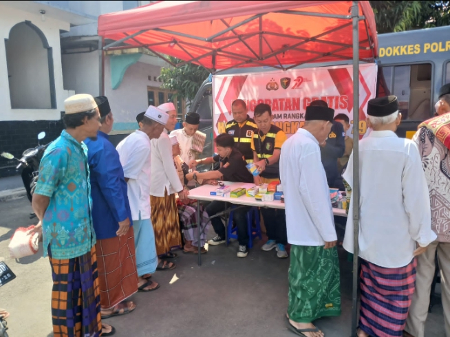 Cirebon – Buser Nusantara Sorot TV – Polresta Cirebon menggelar Bhakti Kesehatan (Bhaktikes) berupa pemeriksaan kesehatan gratis kepada masyarakat, Jumat (20/6/2025). Kegiatan yang berlangsung di Masjid Al Barokah, Desa Matangaji, Kecamatan Sumber, Kabupaten Cirebon, tersebut dilaksanakan dalam rangka memperingati Hari Bhayangkara ke-79.