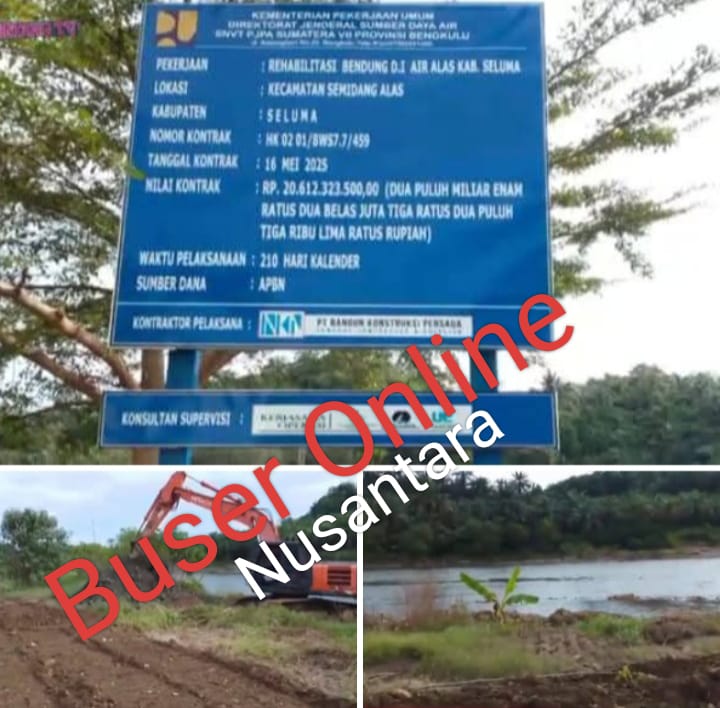 Bengkulu : busernusantarasorottv.com : Seluma 27/6/2025 Proyek Rehabilitasi Bendung Air Seluma Kabupaten Seluma Kec,Semidang Alas Dari Kementerian Pekerjaan Umum Direktorat Jenderal Sumber Daya Air SNVT PJPA SUMATERA VII Provinsi Bengkuku, Yang di Kerjakan Oleh PT.BANGUN KONSTRUKSI PERSADA Dengan Nilai Angaran Rp.20.612.323.500,00 Dua Puluh Miliar Lebih, Waktu Pelaksanaan 210 Hari Kalender, Sumber Dana APBN Tahun 2025 Diduga Kuat Mengunakan Matrial ilegal.