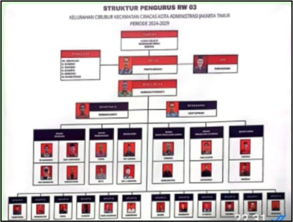 SUSUNAN PENGURUS RW. 03 Masa Bhakti 2024 – 2029. PEMBINA : 1. Lurah Cibubur. 2. Babinkamtibmas. 3. Babinsa. PENASIHAT : 1. K.H.M. Ubaidillah. 2. H. Suparno. 3. H. Ngatijan. 4. H. Sunarto. 5. H. Warsono. 6. M. Idham Cholid. KETUA : Prapto Widodo. LMK. Roni Rosani. WAKIL KETUA : Bambang Purwanto. SEKRETARIS : Bambang Soeto. BENDAHARA : Usup Supriyadi. BIDANG KEAMANAN : 1. Tri Kuswanto. 2. Dedy Supriyanto. 3. Meri M. 4. Sugeng Riyadi. BIDANG PEMBANGUNAN : 1. Tusina. 2. Eko S. BIDANG KESRA : 1. Ustadz Surono. 2. Ustadz Musthofa. BIDANG BADAN PENGOLAHAN SAMPAH : 1. Tumarno. 2. Agam Saputra. BIDANG PEMUDA DAN OLAHRAGA : 1. Beno S. 2. Ade Rangga. BIDANG HUMAS : 1. Kasiono. 2. Sakirman. Adapun KETUA RT. 001, Ngadiyono. RT. 002, Hermansyah. RT. 003, Ismail, RT. 004, Sumardi, RT. 005, Muchlis Ivin. RT. 006, Sumarsono, RT. 007, Basori., RT. 008, Rachmanto, RT. 009, H. Rasito, RT.010, Sugimin, RT. 011, Tuniat, RT. 012, Sudirman.