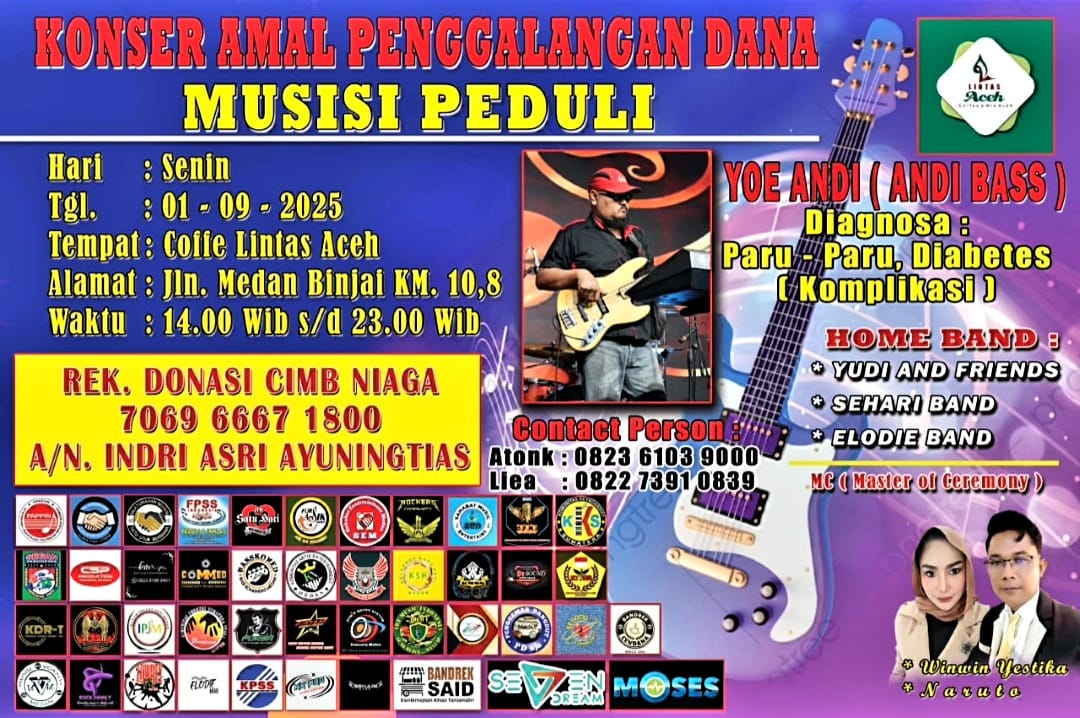 “Kini rekan kami Andi Bass tak lagi mampu berkerja seperti biasa manggung, sudah satu Minggu di rawat RS Latersia Binjai ada keluarga yang harus dia tanggung beliau, konser amal menjadi cara yang umum untuk mendukung musisi yang membutuhkan bantuan finansial tegas” Anto key.