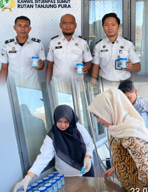 Dalam rangka memperingati Hari Bakti Pemasyarakatan (HBP) ke-62, Rumah Tahanan Negara (Rutan) Kelas IIB Tanjung Pura menggelar tes urine massal bagi pegawai dan warga binaan, Selasa (07/04).