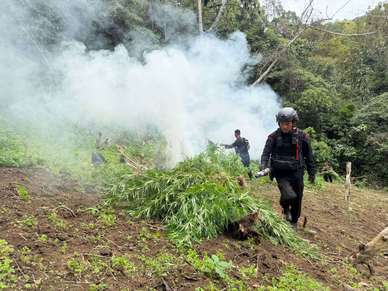 Sekitar pukul 13.00 WIB, tim gabungan akhirnya tiba di lokasi ladang ganja yang tersembunyi di area perbukitan terpencil. Di bawah terik matahari dan medan yang cukup berat, personel Brimob dengan sigap melaksanakan pemusnahan terhadap ribuan batang tanaman ganja dengan cara pembakaran di tempat. Kegiatan pemusnahan ini berlangsung dengan lancar dan diawasi langsung oleh Kompol Zaenal Muhlisin selaku pimpinan lapangan.
