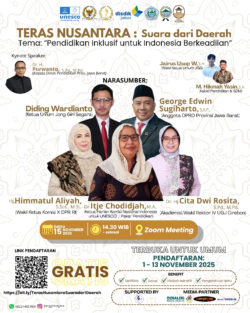 Kegiatan yang dilaksanakan pada Sabtu, 15 November 2025, menghadirkan berbagai narasumber diantaranya Dr. Itje Chididjah, MA (Ketua Harian Komisi Nasional Indonesia untuk UNESCO), Dr, Hj. Cita Dwi Rosita, M.Pd. (Akademisi/Wakil Rektor IV UGJ Cirebon) George Edwin Sugiharto, S.IP (Anggota DPRD Provinsi Jawa Barat), Diding Wardianto, S.Sos (Ketua Umum Jong Giri Segara) Seminar ini bertujuan memperkuat pemahaman tentang praktik pendidikan inklusif, memetakan tantangan di Daerah, serta merumuskan rekomendasi kebijakan untuk mendorong pemerataan akses pendidikan di seluruh Indonesia.