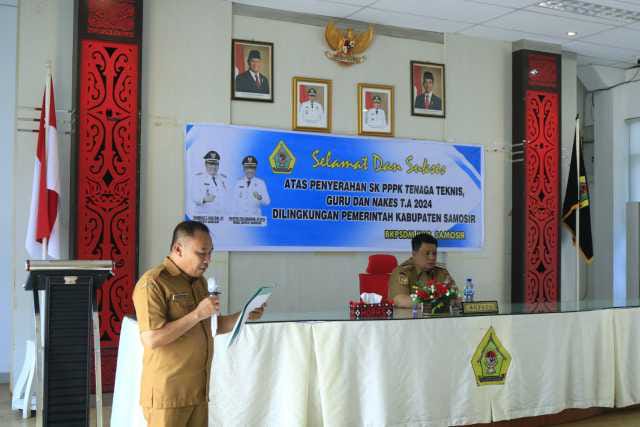 Samosir,busernusantarasorottv.com– Bupati Samosir Vandiko T. Gultom menyerahkan surat keputusan (SK) transmisi P3K Tahap II kepada 21 orang yang dinyatakan lulus ujian P3K formasi 2024. “Saya harap agar kita layani masyarakat dengan sepenuh hati, gunakan kompetensinya bapak ibu memiliki. Inovasi dan kreatifitas bapak ibu kami perlukan guna mempercepat program untuk menyejahterakan masyarakat” kata Vandiko saat memberikan Arahan di Aula Kantor Bupati Samosir, 01/09.