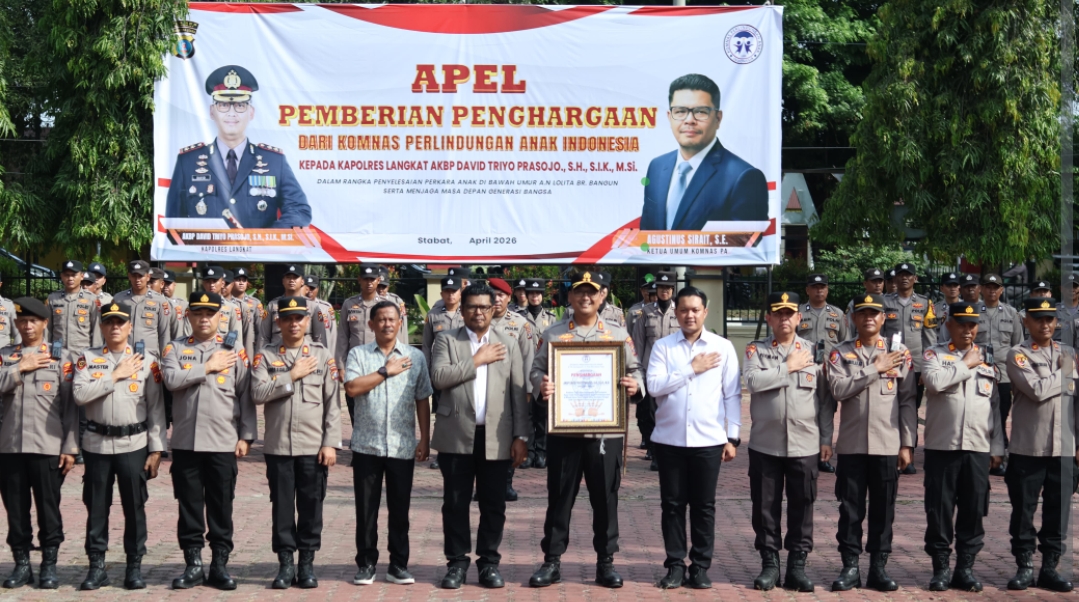 Penghargaan tersebut diserahkan langsung oleh Ketua Umum Komnas PA Pusat, Agustinus Sirait, S.E., kepada Kapolres Langkat AKBP David Triyo Prasojo, S.H., S.I.K., M.Si., di Lapangan Jananuraga Polres Langkat, Selasa (28/4/2026).