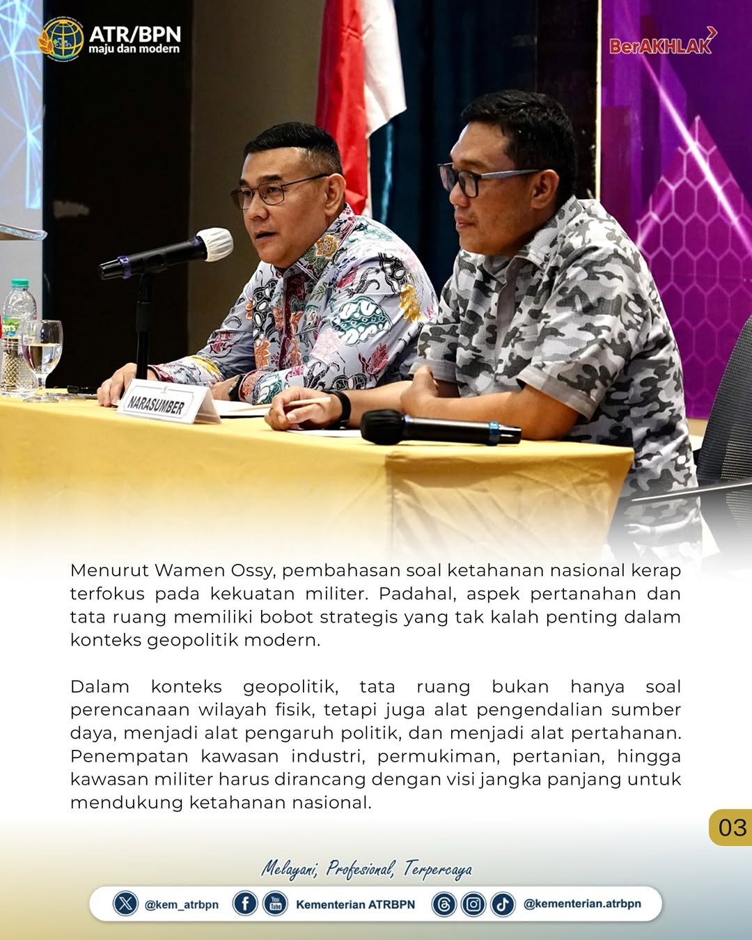 Menurutnya, pembahasan tentang ketahanan nasional selama ini sering kali hanya menyoroti aspek militer. Padahal, pertanahan dan tata ruang merupakan faktor strategis yang tak kalah penting, terutama dalam konteks geopolitik dan pengelolaan sumber daya nasional.
